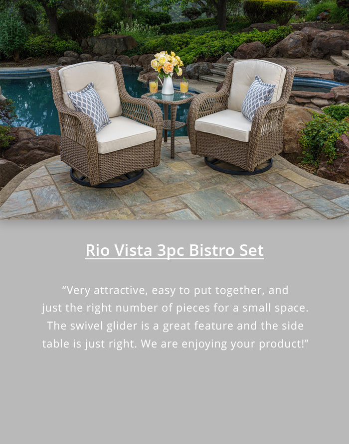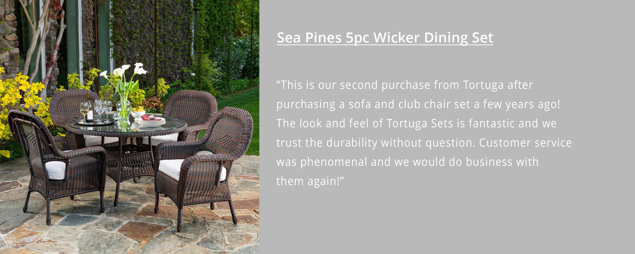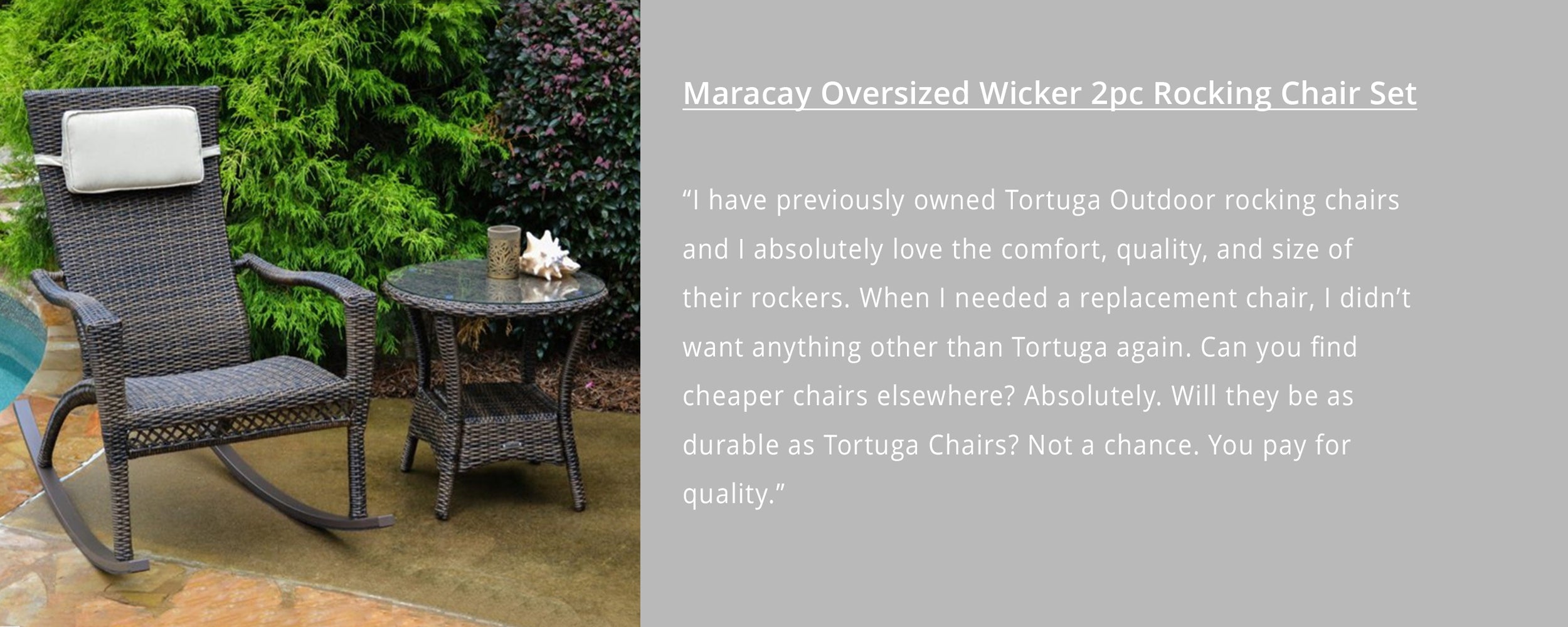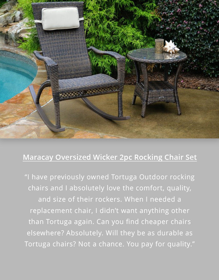 Our outdoor patio furniture will give you endless hours of comfortable sitting time. Create a living space that truly reflects who you are from entertaining guests outdoors with a wicker sofa set or outdoor bistro set to enjoying a fire at night with a rocking chair or outdoor lounge set. Lounge poolside all year round on an outdoor couch or fireside rocker seat. With backyard patio furniture from Tortuga Outdoor, it won’t matter what the season is. Your outdoor space will always feel comfortable and inviting.